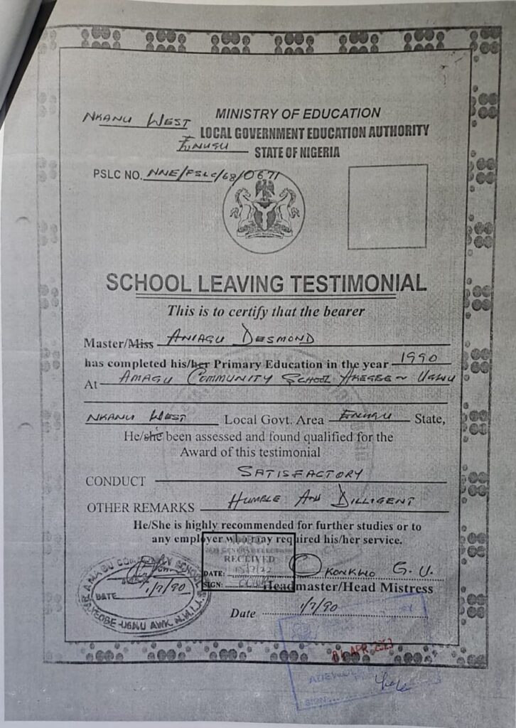 Aside the WAEC certificate scandal, it is obvious from another document accompanying the Form EC9 of Mr. Iloabuchi Desmond Aniagu, that he presented a forged First School Leaving Testimonial purportedly issued to him by the ‘Nkanu West Local government Education Authority of Nkanu West Local Government Area of Enugu State’ in 1990 to INEC.