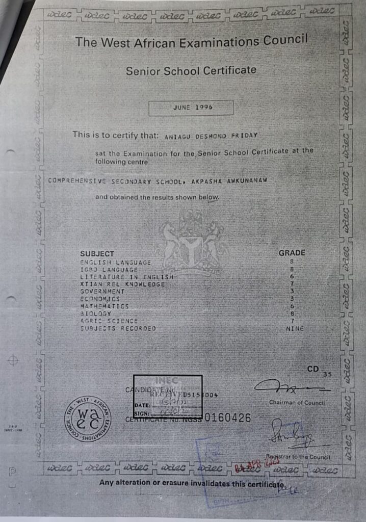 During his evidence, the 1st Petitioner, Hon. Johnpaul Anih, tendered a letter dated 27th April, 2023, which was addressed to his counsel, Mr. Chimezie Ogenna Nwodo, by the West African Examination Council (WAEC) in response to an enquiry made through his counsel’s letter dated 11th April 2023. In the letter of 27th April, 2023, WAEC unequivocally stated that “the Council’s records show that Candidate Aniagu Desmond Friday sat the May/June 1996 examination….”, buttressing the allegation of the Petitioners that the 1st Respondent, Mr. Iloabuchi Desmond Aniagu of the Peoples Democratic Party DID NOT sit for the WAEC examination held in 1996.