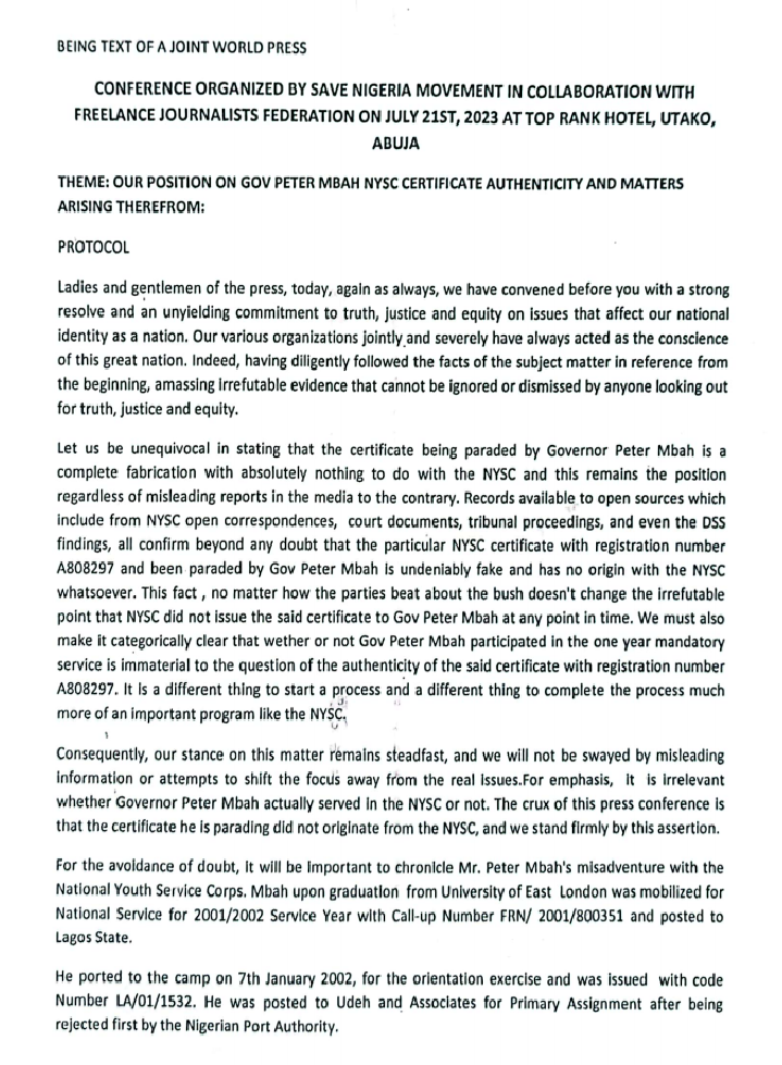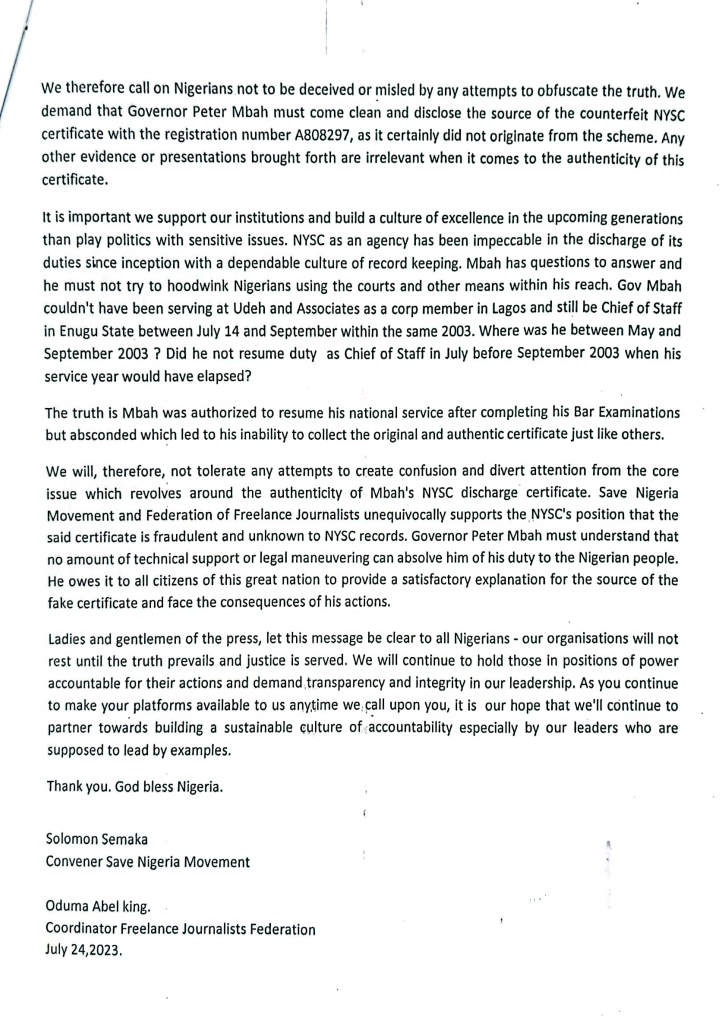 Home Politics VIDEO: Gov. Mbah’s NYSC Certificate Remains Fake Despite Misleading Reports To The... Politics VIDEO: Gov. Mbah’s NYSC Certificate Remains Fake Despite Misleading Reports To The Contrary – Groups Insist By Dailygazettenig - July 24, 2023 FacebookTwitterPinterestWhatsApp Gov. Mbah’s NYSC Certificate Remains Fake Despite Misleading Reports To The Contrary – Groups Insist https://www.dailygazettenig.com/wp-content/uploads/2023/07/VID-20230724-WA0028.mp4 Press Conference By Save Nigeria Movement In Collaboration With Freelance Journalists Federation RELATED ARTICLESMORE FROM AUTHOR 2027: Obi Unlikely To Secure 5% Northern Votes – Pastor Ashimolowo Approached By APC, I’ll Remain In PDP – Senator Natasha INEC Disowns Factional Accord Party Governorship Primary In Osun MOST COMMENTED President Tinubu To Embark On State Visit To France Dailygazettenig - November 26, 2024 NARTO, Other Petroleum Associations Back NUPENG, Threaten Nationwide Shutdown Over Dangote’s Direct Supply Plan Dailygazettenig - September 8, 2025 Protesters, Journalists Beaten In Rivers, Activists Arrested In Yobe Dailygazettenig - April 7, 2025 - Advertisement - CATEGORYPolitics5004Local2161FOREIGN828Government760Education496Security271Business250