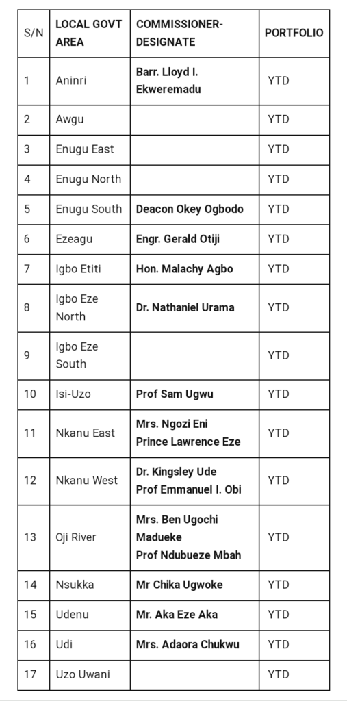A critical analysis made by Daily Gazette shows that Awgu LGA, Enugu East, Igbo-eze South, Enugu North and Uzouwani were not captured in the commissioner nominees sent to the state assembly for confirmation.