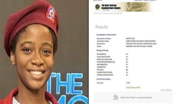 The student of Deeper Life High School who made the highest score of 360 in this year’s Unified Tertiary Matriculation Examination (UTME), Kamsiyochukwu Nkechinyere Umeh, has cleared all her papers in the West African Senior School Certificate Examination (WASSCE) with eight A1 and one B2.