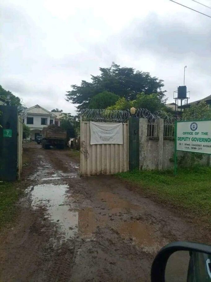 The signpost carries the inscription “Office of the Deputy Governor, NO 7, Dennis Osadebey Avenue, GRA, Benin City.”