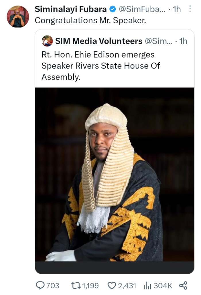 Home Politics BREAKING: Rivers State House Of Assembly Gets New Speaker Politics BREAKING: Rivers State House Of Assembly Gets New Speaker By Dailygazettenig - October 30, 2023 FacebookTwitterPinterestWhatsApp Former Majority leader, Rivers State House of assembly, Edison Ehie has emerged as the new Speaker of the assembly. Governor Siminalayi Fubara in his official twitter handle on Monday afternoon, congratulated the speaker. Detail shortly…. RELATED ARTICLESMORE FROM AUTHOR 2027: Coalition Begins Nationwide Mobilisation For President Tinubu Former Assembly Speaker Wins Osun ADC Governorship Ticket Another PDP Governor Set To Dump Party For APC MOST COMMENTED Borno Police Confirms Death Of Three Children Found In Parked Car Dailygazettenig - September 26, 2025 Lagos Takes The Lead As 36 States, FCT Generate N1.9tr IGR Dailygazettenig - October 23, 2023 Edo Activist Who Attacked Labour Party National Chairman Abure At Airport Arrested Dailygazettenig - September 27, 2025 - Advertisement - CATEGORYPolitics5011Local2163FOREIGN829Government760Education497Security271Business251