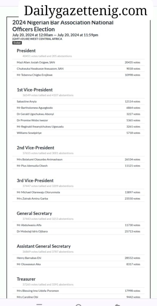 Mazi Afam Osigwe, SAN, has emerged victorious in the Nigerian Bar Association (NBA) election, Daily Gazette reports.