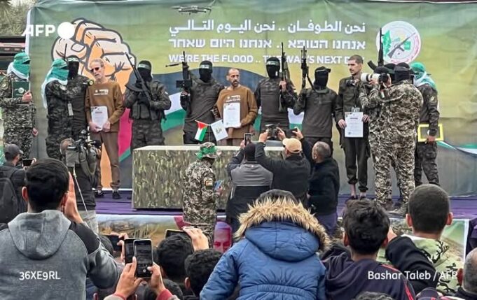 Masked gunmen escorted the three captives onto a stage, which was decorated with images of destroyed Israeli military vehicles and an image of Israeli Prime Minister Benjamin Netanyahu.