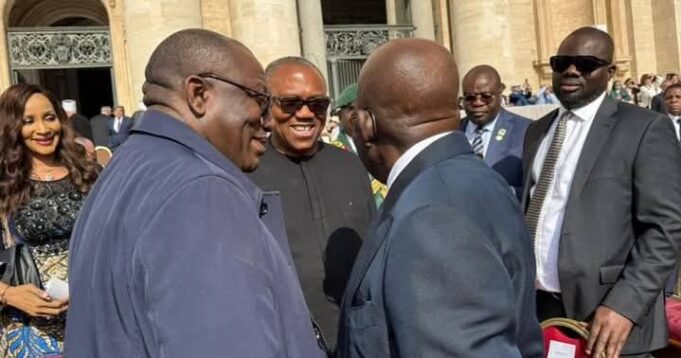 President Bola Tinubu, former Labour Party presidential candidate Peter Obi, and ex-Ekiti State Governor Kayode Fayemi had a brief but notable interaction at the Vatican on Sunday during the installation mass of Pope Leo XIV.