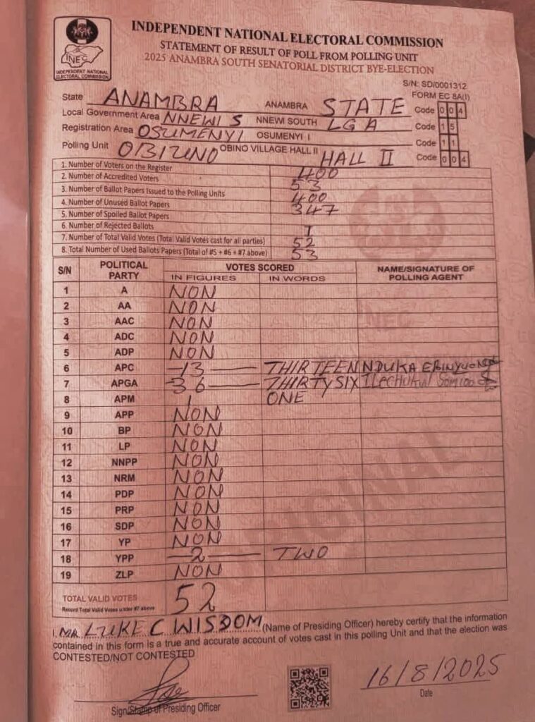 The All Progressives Congress (APC) governorship candidate for the upcoming November election in Anambra State, Prince Nicholas Ukachukwu, has lost his own polling units to the All Progressives Grand Alliance (APGA) in the ongoing Anambra South Senatorial District by-election, DAILY GAZETTE reports.