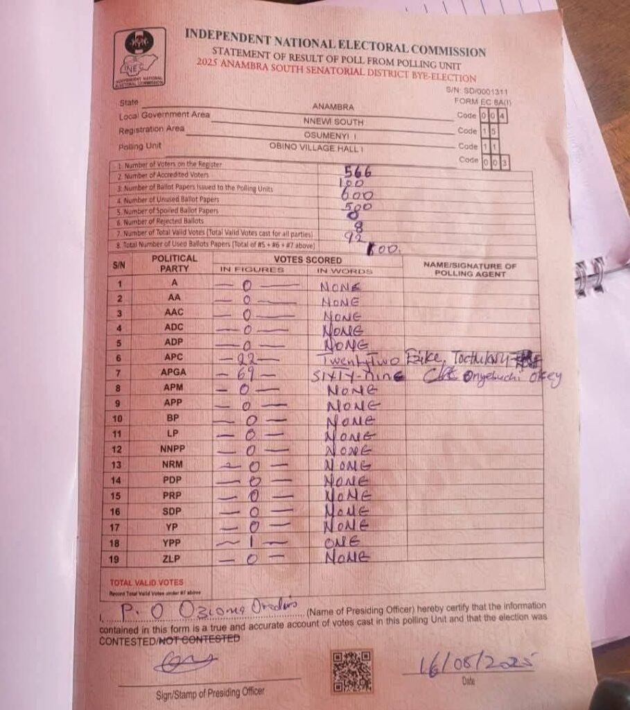 The All Progressives Congress (APC) governorship candidate for the upcoming November election in Anambra State, Prince Nicholas Ukachukwu, has lost his own polling units to the All Progressives Grand Alliance (APGA) in the ongoing Anambra South Senatorial District by-election, DAILY GAZETTE reports.