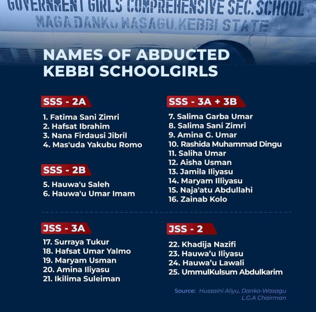 Three days after 25 schoolgirls were abducted from their hostel at the Government Girls Comprehensive Senior Secondary School (GGCSS) in Maga, Kebbi State, Hussaini Aliyu, Chairman of Danko-Wasagu Local Government Area, where the incident happened, released the names of the kidnapped students.