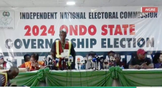 The announcement was made at 2:30pm on Sunday at the Independent National Electoral Commission (INEC) collation center in Akure, the state capital.