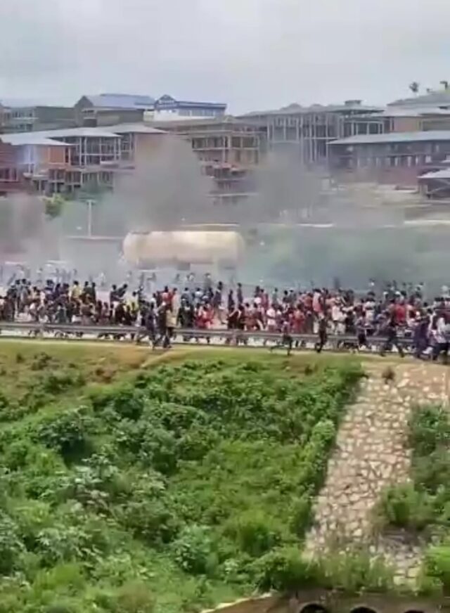 Initially calm, the protest was infiltrated by groups carrying sticks and leaves, chanting “Bamuyi Bamuyi,” with many underage participants seen without any security presence around them.